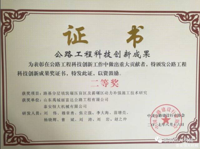 熱烈慶祝泰安恒大機械有限公司榮獲山東公路學會科學技術一等獎